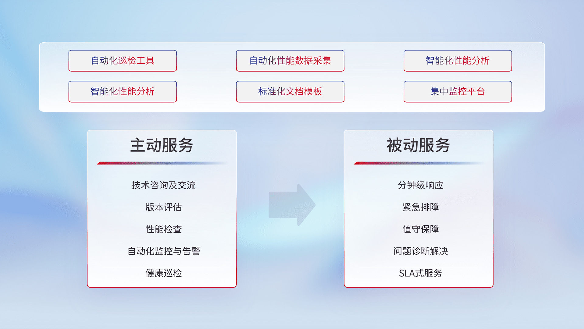 智能化工具和标准化文档,,,保障服务质量,,提供主动服务(包含技术咨询、、、版本评估、、性能检查、、自动化监控与告警、、健康巡检)和被动服务包含(分钟级响应、、紧急排障、、值守保障、、、、问题诊断解决、、、、SLA服务)。。。。